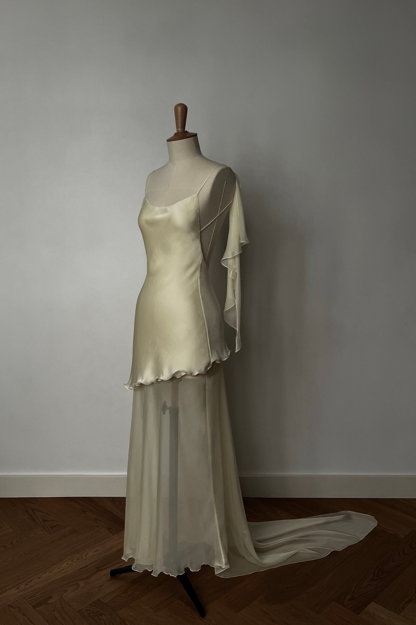 La Jonquille dress est réalisée en charmeuse de soie doublée, sublimée par un fond en mousseline de soie teintée à la main dans un jaune pâle délicat. Sa coupe évoque les lignes naturelles d’une fleur de jonquille. Deux pans de mousseline, fixés aux bretelles, tombent avec légèreté dans le dos plongeant, apportant une dimension aérienne et poétique à la silhouette – Fabriquée à Paris