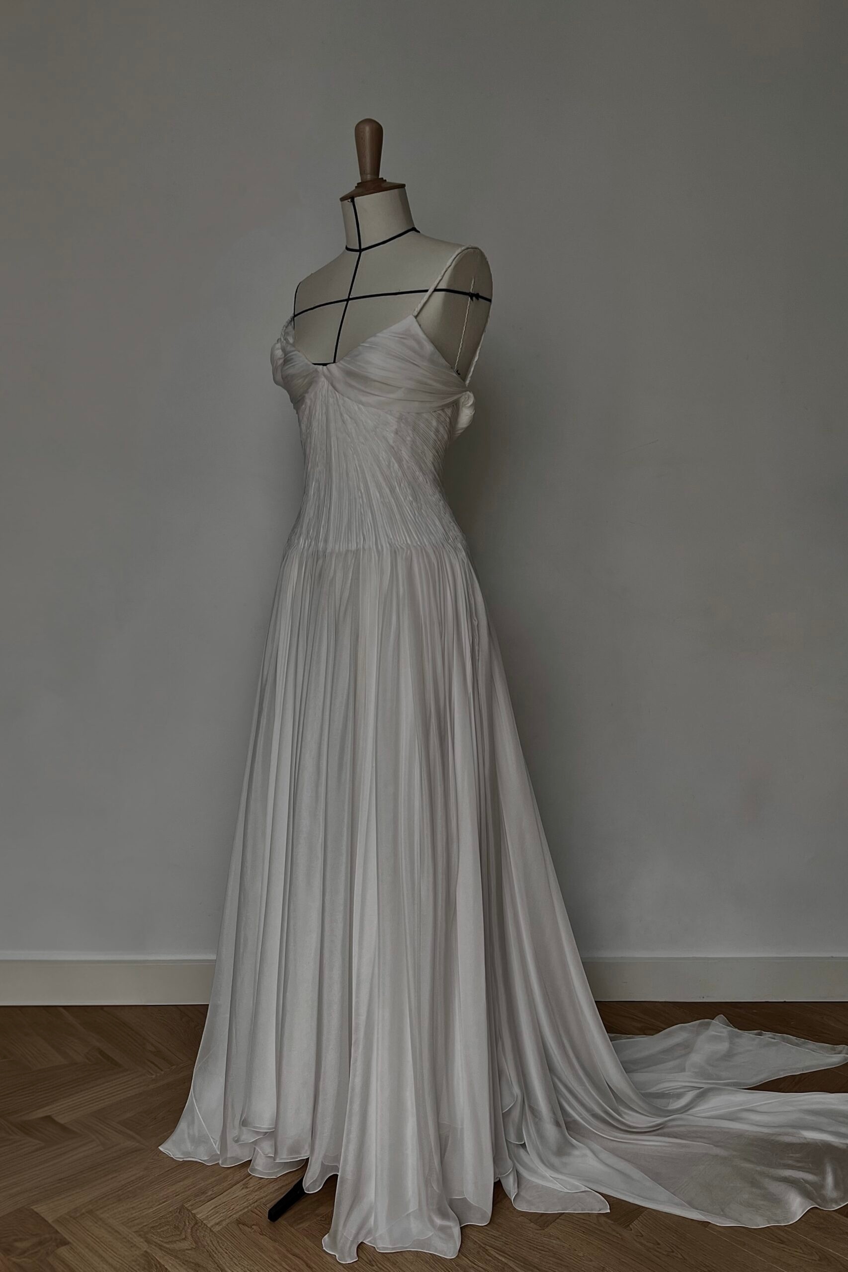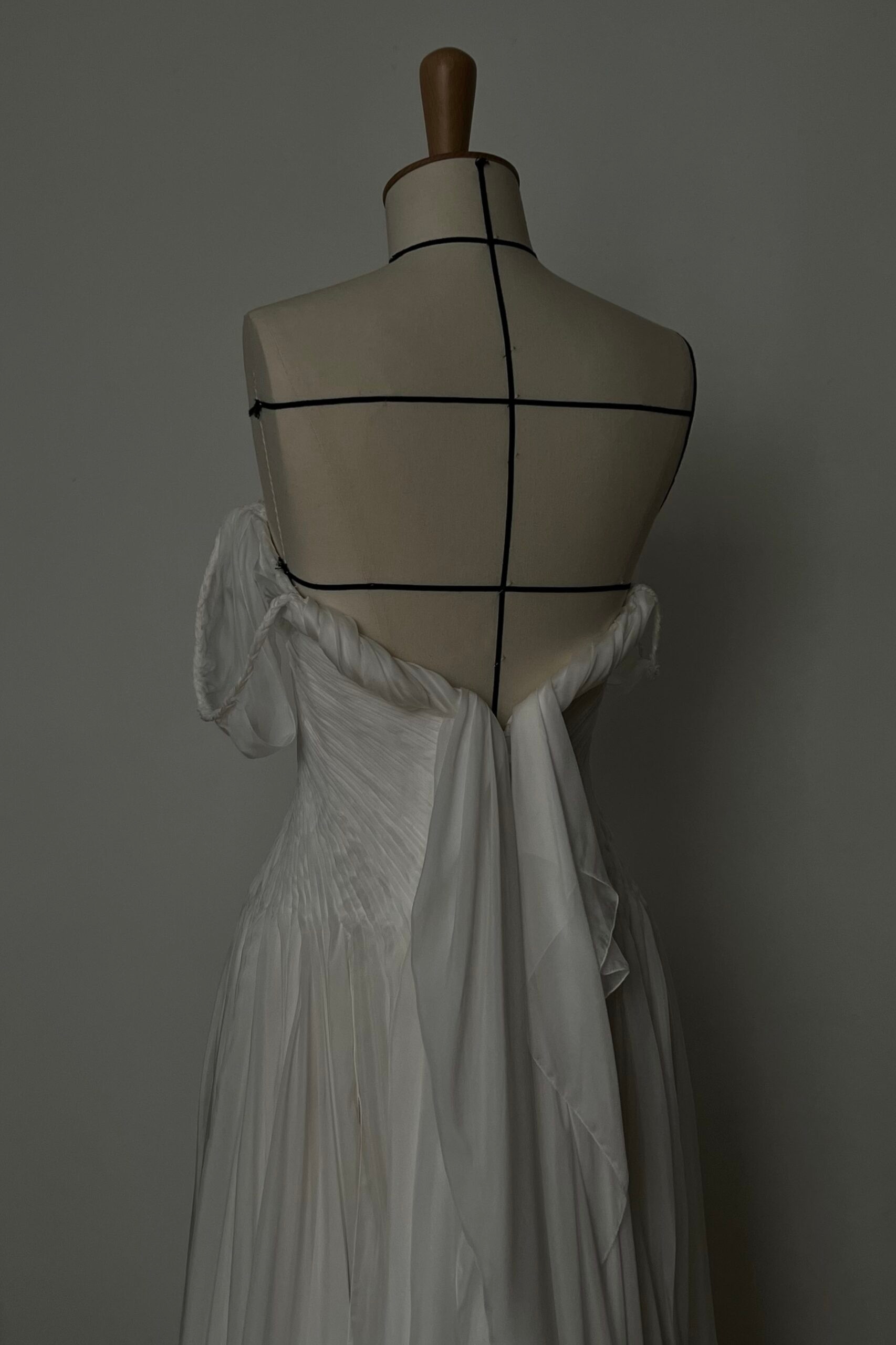 La Swan dress est une robe de mariage avec un corset en tulle de coton, élégamment recouvert de plis faits main en soie nacrée. Un drapé délicat sublime le buste, se prolongeant vers l’arrière pour créer une cascade en mousseline. Des manches délicatement drapées et tressées viennent sublimer l’ensemble, ajoutant une dimension poétique à ce design d’une élégance intemporelle – Fabriquée à Paris